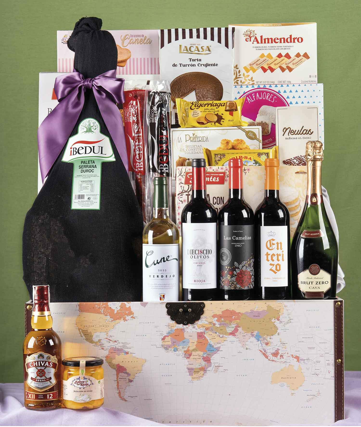 El Baúl Acuario reúne una paleta serrana Duroc como pieza central, dos ibéricos de bellota para completar la tabla y una selección amplia de bebidas: whisky 12 años, cava brut nature, tres tintos (Rioja, selección y D.O. Utiel-Requena) y un blanco verdejo. Se completa con una mesa dulce variada de turrones, chocolate y repostería tradicional, además de un toque de conservas y un detalle lúdico de participación navideña.