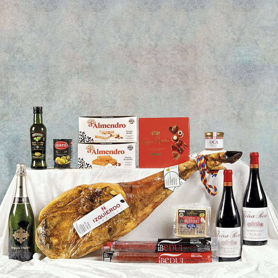 Jamonera 205 es el lote navideño premium que combina la paleta ibérica de cebo brida blanca IZQUIERDO de 4,5–5 kg como protagonista con salchichón y chorizo de bellota IBEDUL y queso de oveja EL PASTOR Ruffino. Brinda con cava SEGURA VIUDAS brut y dos botellas de Viña Real reserva (D.O. Rioja) para un festín inolvidable.