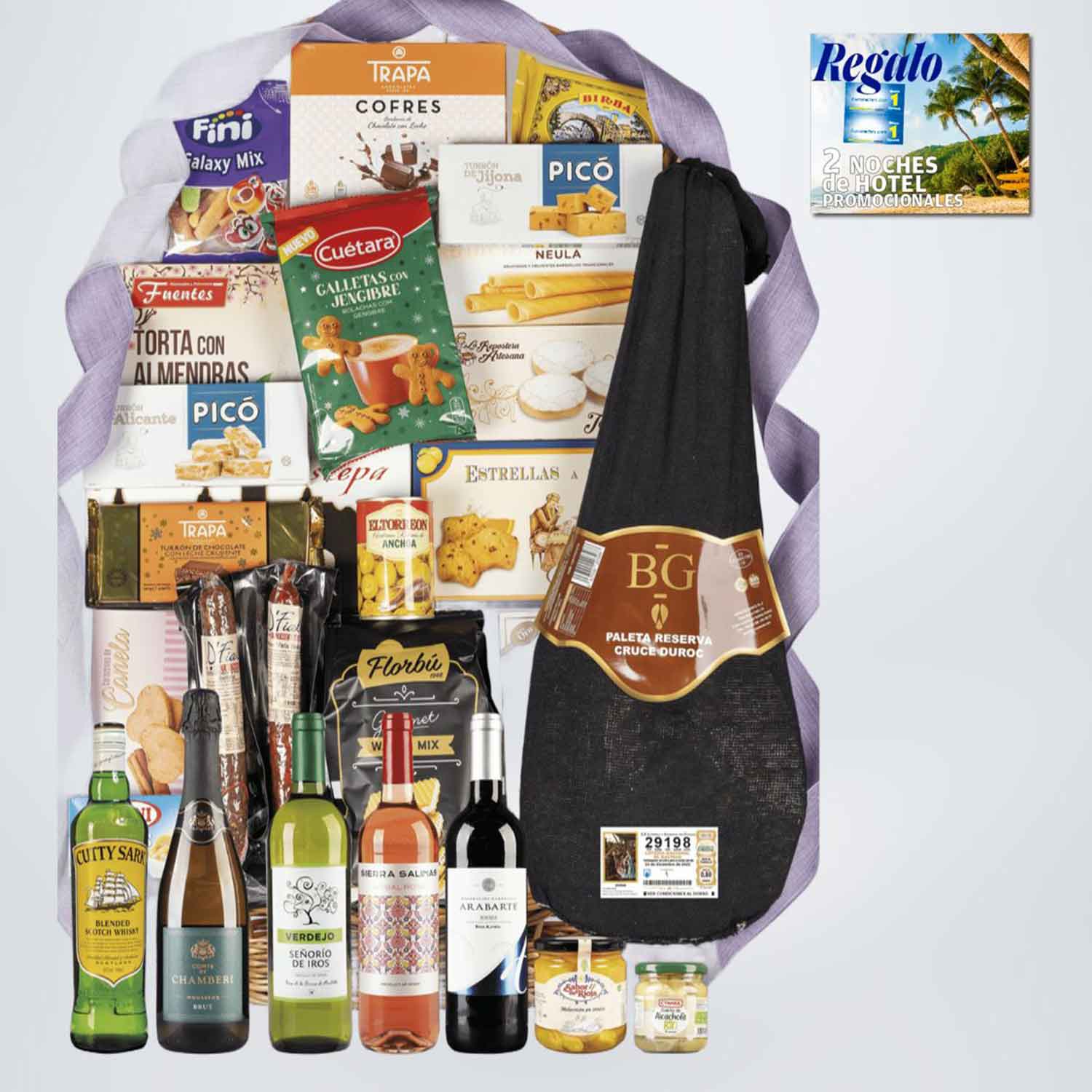 La Cesta Alhambra reúne charcutería ibérica, una selección de vinos y dulces tradicionales, ideales para regalar o disfrutar en Navidad. Destacan la paleta serrana, los vinos con D.O. y los bombones artesanos. Una opción completa y elegante para sorprender estas fiestas. ¡Haz tu pedido ahora!