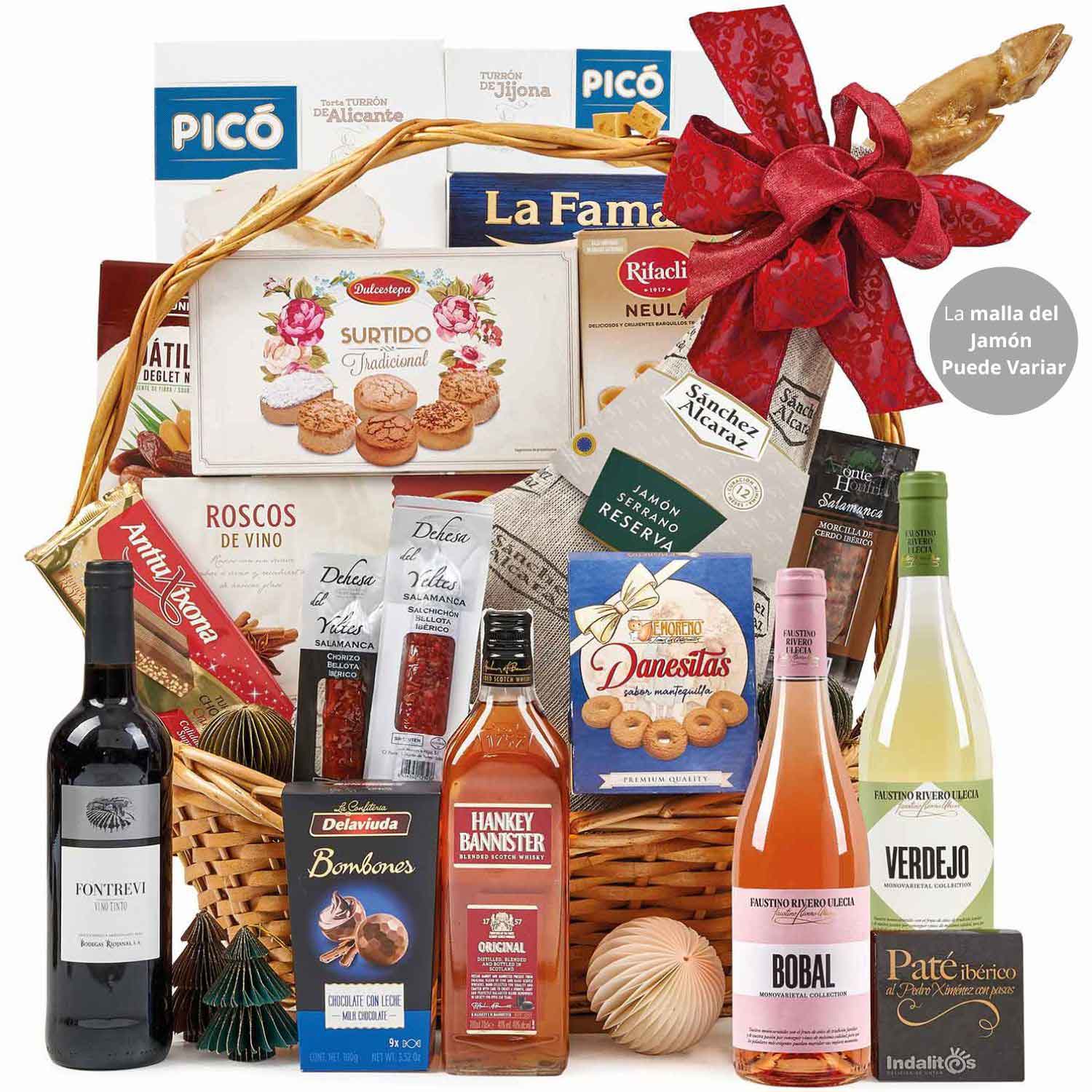 Completan esta cesta una combinación equilibrada de vinos tinto, blanco y rosado, junto con un suave whisky escocés. La experiencia dulce está asegurada con turrones clásicos, mazapanes, bombones y surtidos navideños, todo de primeras marcas.