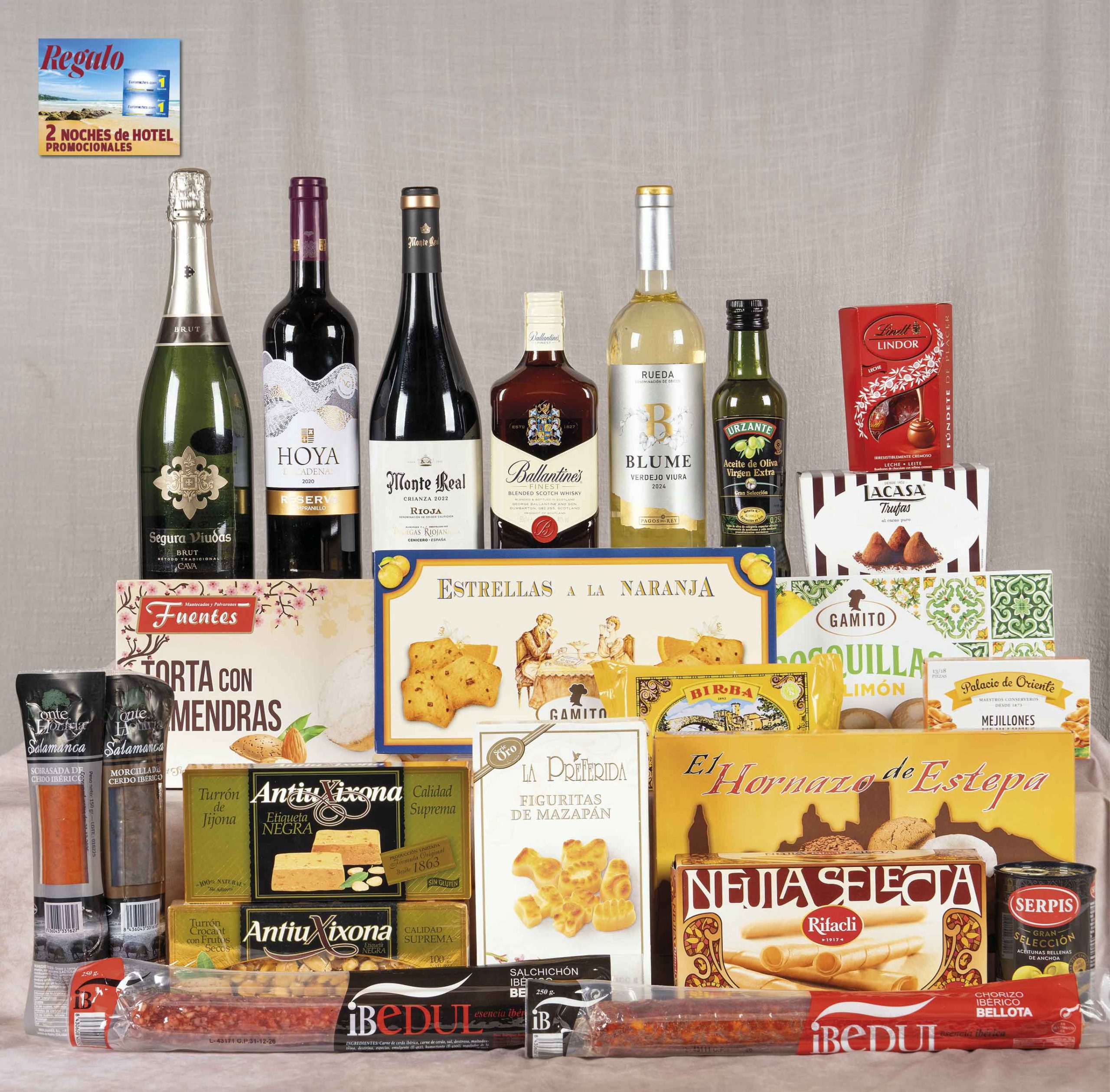 Lote P 511 es una propuesta navideña pensada para sorprender con una experiencia gastronómica completa. Incluye embutidos ibéricos de bellota, cava, whisky, vinos con D.O., turrones de etiqueta negra y una cuidada selección de dulces y conservas gourmet. Perfecta para regalar sabor, variedad y calidad en Navidad.
