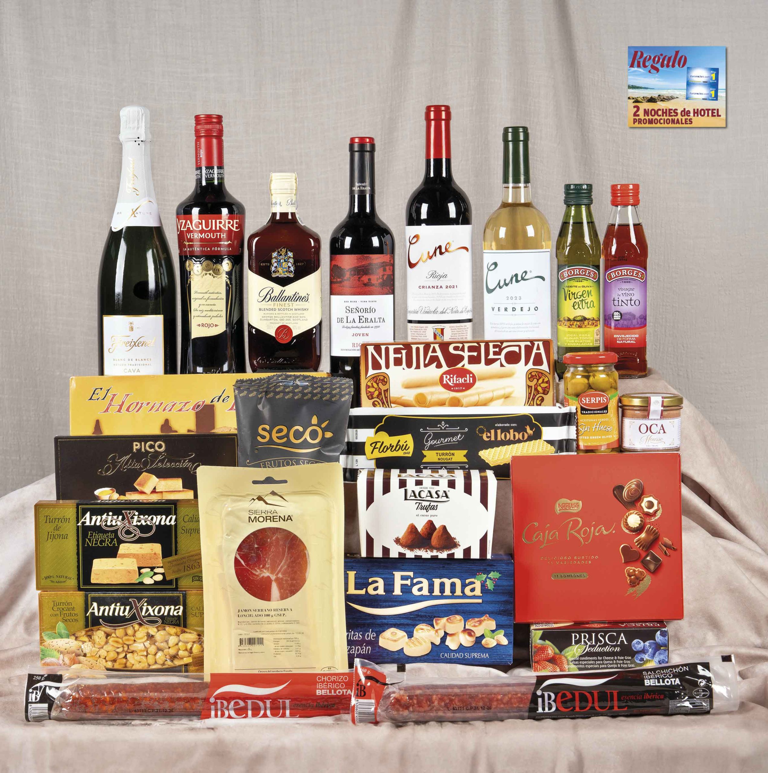 Lote P 511 es una propuesta navideña pensada para sorprender con una experiencia gastronómica completa. Incluye embutidos ibéricos de bellota, cava, whisky, vinos con D.O., turrones de etiqueta negra y una cuidada selección de dulces y conservas gourmet. Perfecta para regalar sabor, variedad y calidad en Navidad.