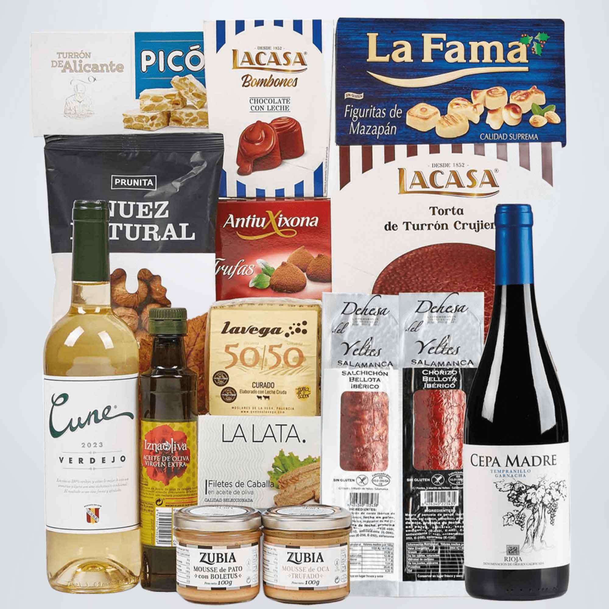Las conservas premium, el AOVE Iznaoliva y las mousses gourmet Zubia completan un conjunto que destaca por su calidad y equilibrio. Todo se presenta en una Caja Kraft, práctica y elegante, que protege los productos y refuerza la presentación del regalo.
