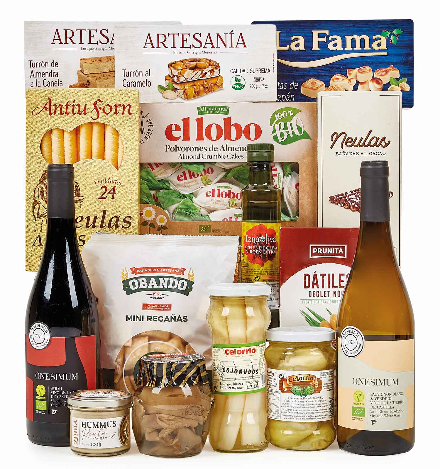 La Cesta 226 – Selección Vegana ha sido cuidadosamente diseñado para quienes buscan un obsequio respetuoso y sabroso. Incluye vinos veganos Onesimum, conservas vegetales, hummus, AOVE premium y una cuidada selección de dulces tradicionales.