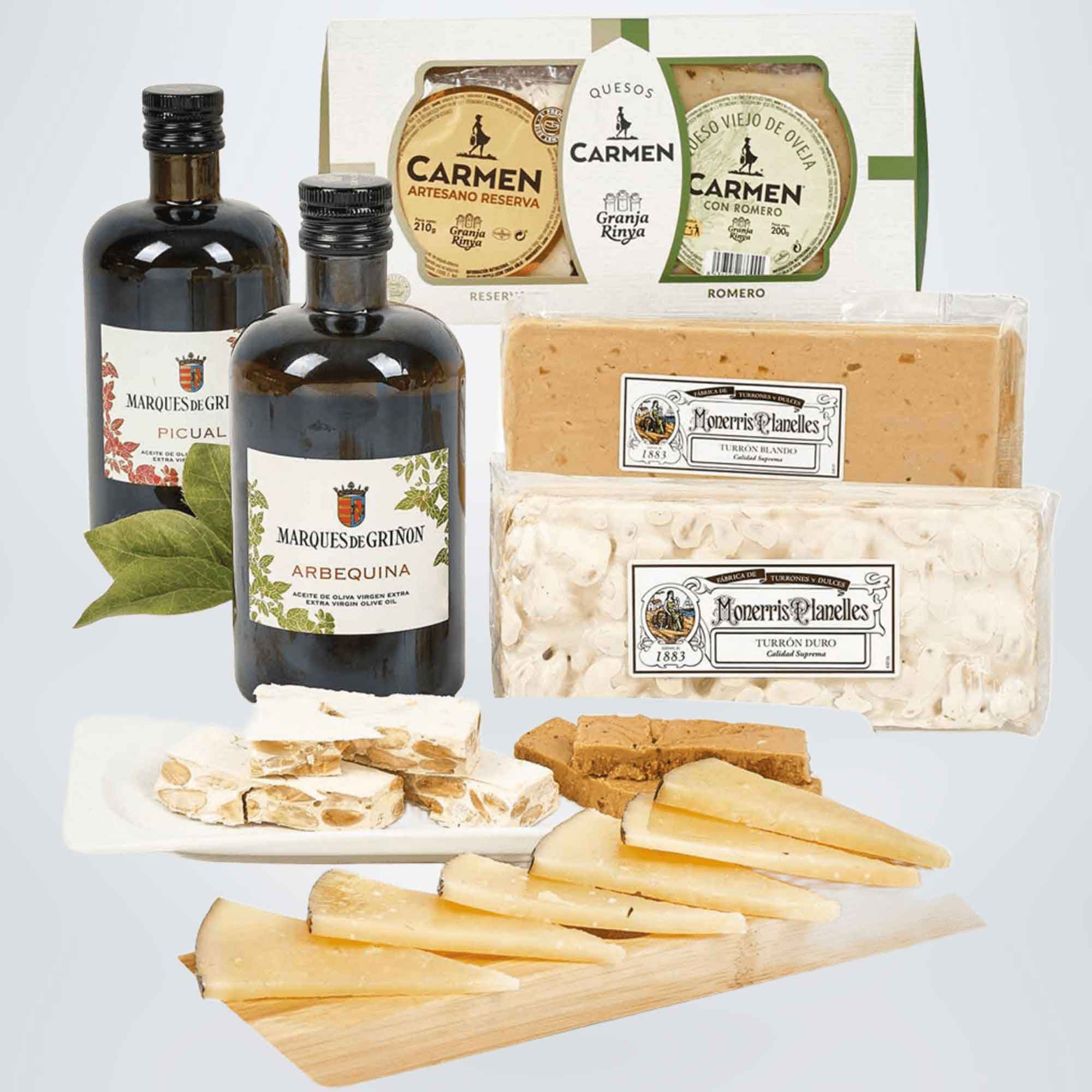 El detalle diferencial lo ponen los aceites Marqués de Griñón, en sus variedades Arbequina y Picual, que aportan sabor y elegancia a cualquier mesa. Todo se presenta en una Caja Delycius, robusta y estilizada, que protege y realza el contenido.