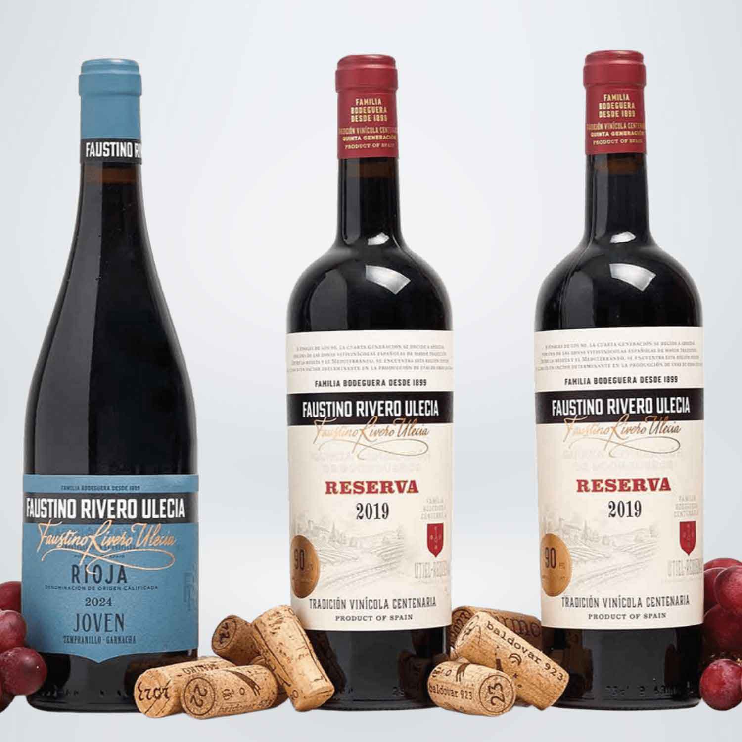 La tercera botella es un Tinto Faustino Rivero Ulecia D.O. Rioja Joven, una denominación de origen de renombre internacional. Los vinos de Rioja son conocidos por su elegancia y profundidad de sabor, y este no es la excepción. Este vino destaca por sus notas de frutas maduras, especias y un sutil toque de vainilla, lo que lo convierte en el complemento perfecto para carnes, quesos y platos más robustos. Su carácter suave pero complejo lo hace ideal para cualquier ocasión.