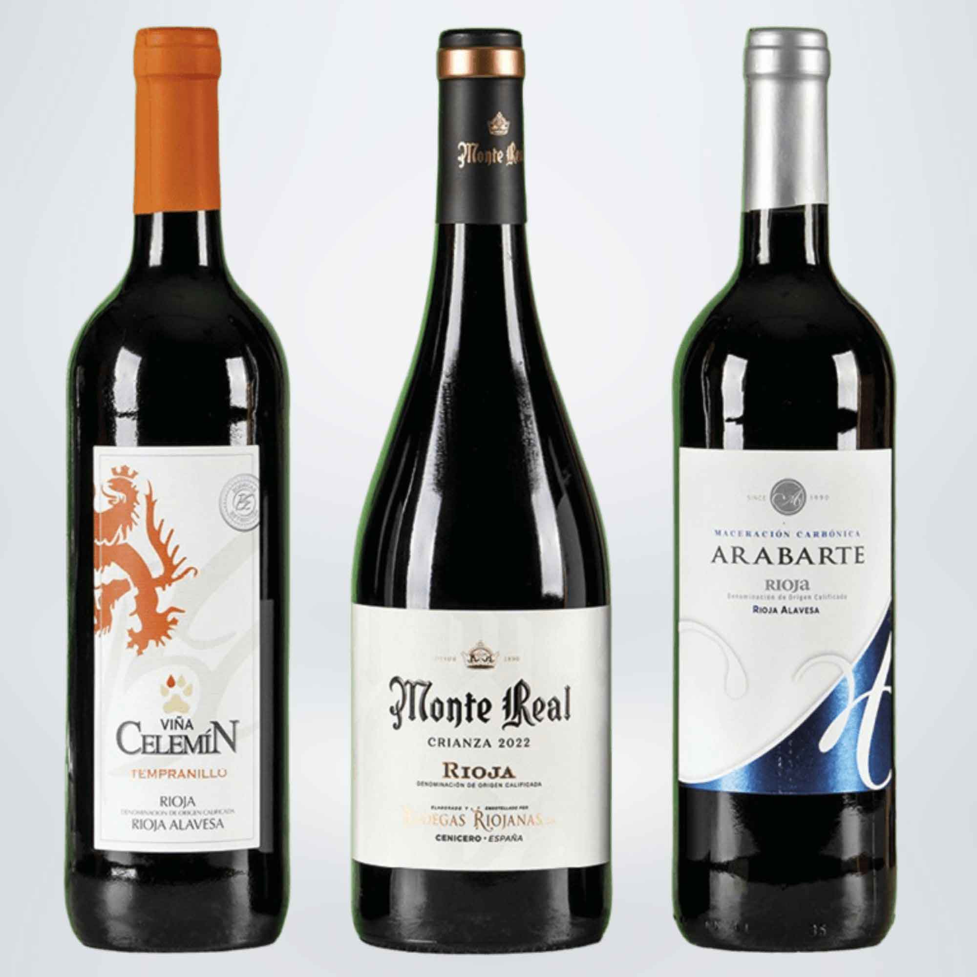 El Estuche 709 reúne tres tintos de Rioja complementarios para acertar en cualquier mesa: MONTE REAL Crianza (equilibrio fruta–barrica), VIÑA CELEMÍN 100% tempranillo (perfil directo y accesible) y ARABARTE maceración carbónica (muy frutal y fresco). Una selección pensada para aperitivos, guisos, asados y tablas de quesos.